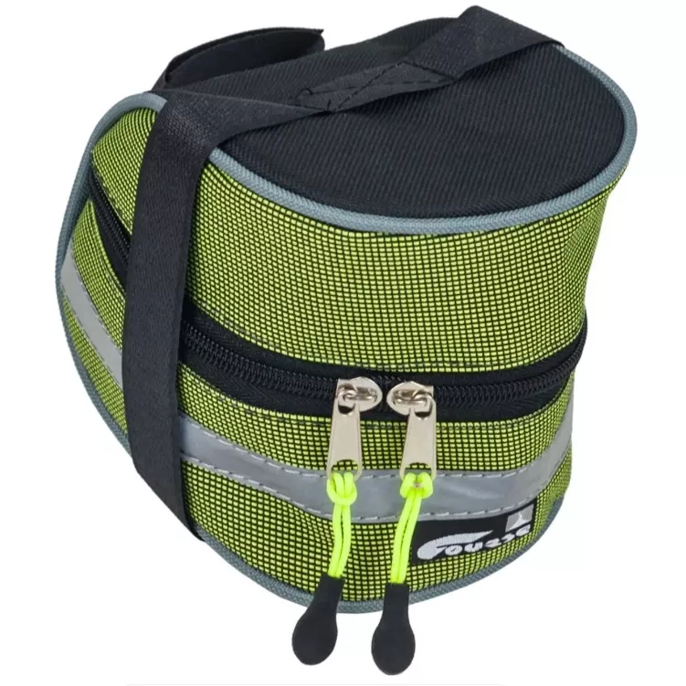 Комплект: светоотражающая полоса, пластиковый вкладыш, опоясывающая сумку лента "липучка" для крепления к седлу и лента "липучка" для крепления к подседельной трубе, застёжка молния (2замка с пулерами), система для крепления ключей, по периметру - жёсткий кант, обшитый тканью.