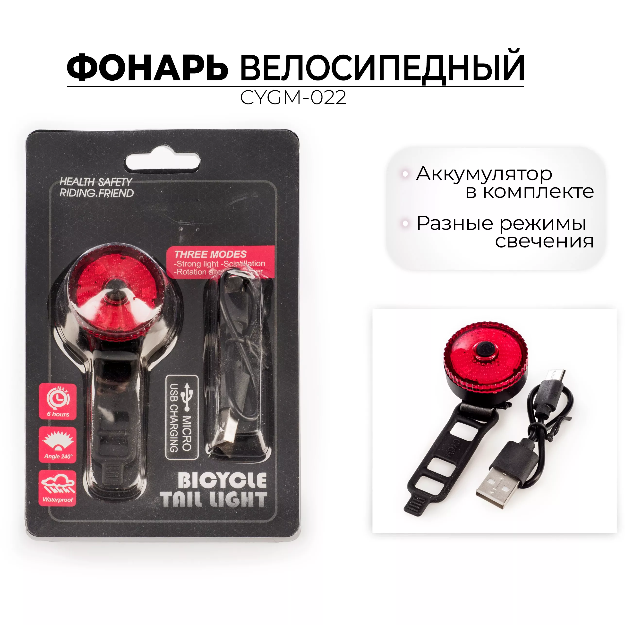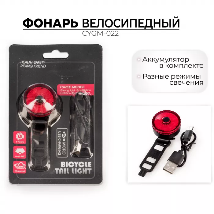 Водонепроницаемый задний фонарь, разные варианты свечения, зарядка Micro USB.