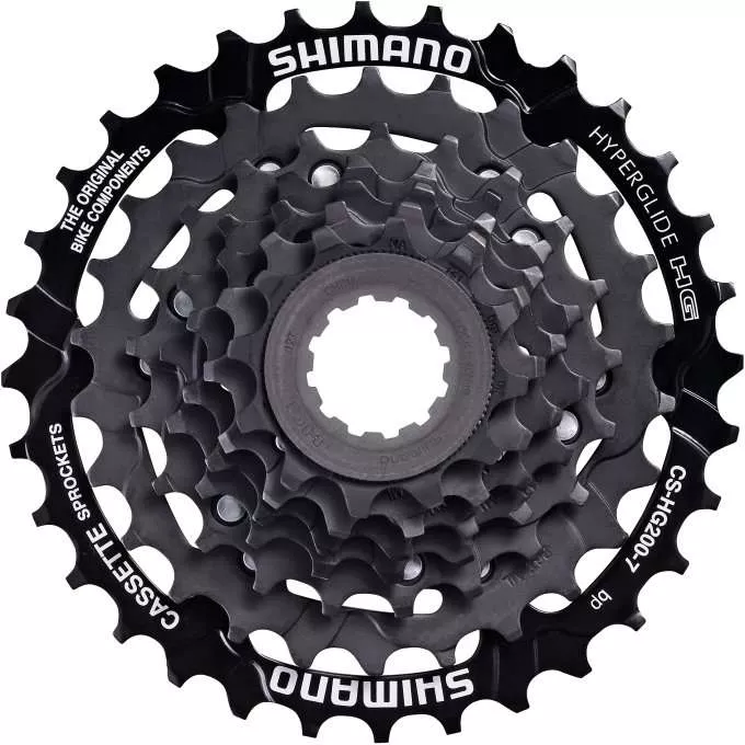 CS-HG200 - надежная кассета, разработанная японской компанией Shimano для велосипедов любительского уровня. Состоит из семи звездочек с количеством зубьев от 12 до 32 штук. Совместима с трансмиссиями 3х7 передач. Фирменная технология Hyperglide значительно улучшает переключение с меньшей звезды на большую, что делает работу всей трансмиссии четкой и быстрой.