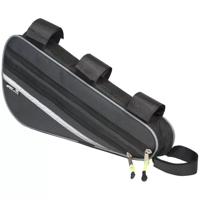 Сумка удлиненной формы крепится за рулевую колонку в передней части рамы. В сумку помещается бутылка с водой объемом 1,5 л. Комплектуется: светоотражающей полосой, двумя боковыми молниями (замки с пулерами), доп. большим наружным карманом, жёстким кантом, обшитым тканью по периметру с двух сторон, системой для крепления ключей.