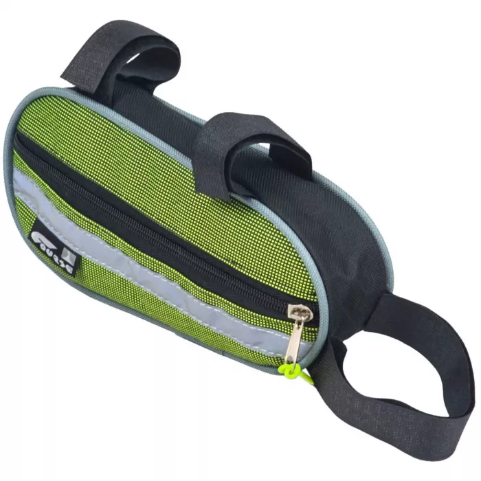 Маленькая сумка в передний треугольник рамы из непромокаемой ткани имеет 1 карман на замке и светоотражающую вставку.