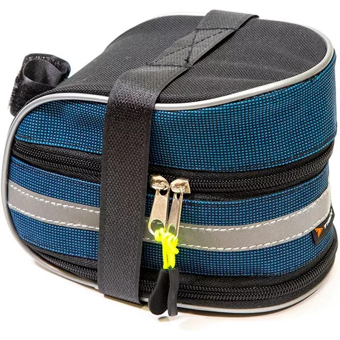Большая сумка под седло Course Мастер имеет пластиковую вставку для сохранения формы, 2 замка (1 отделение, 2-й делает сумку больше), а так же липучку, огибающую периметр и крепление за подседельный штырь, светоотражающий элемент